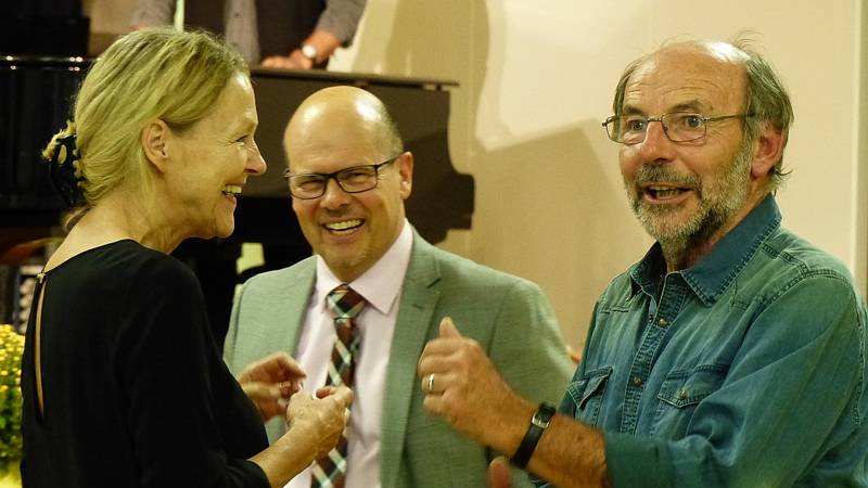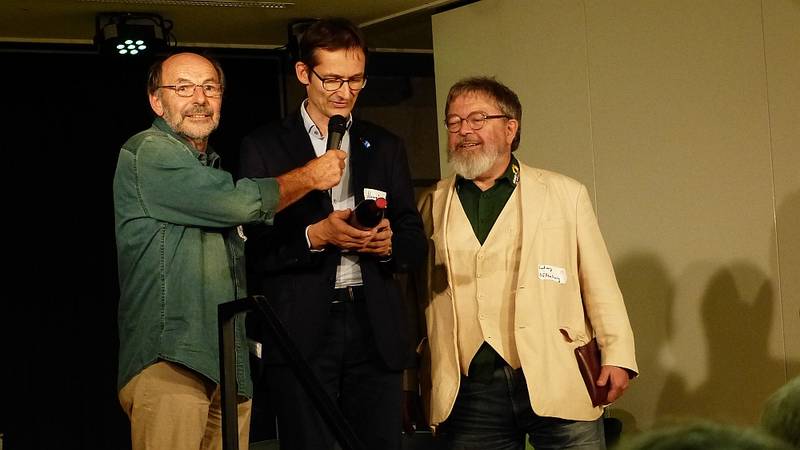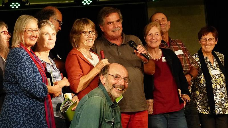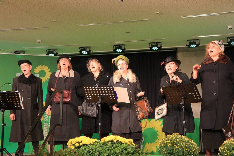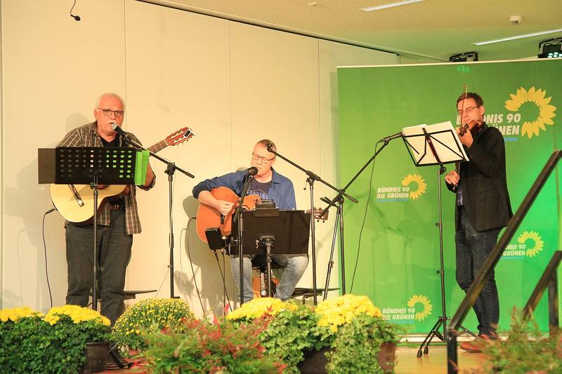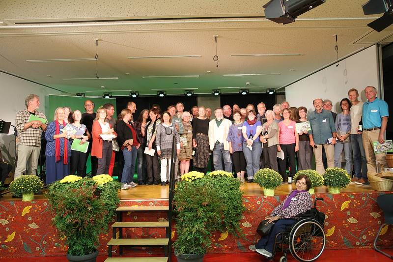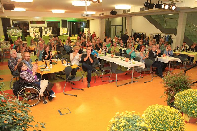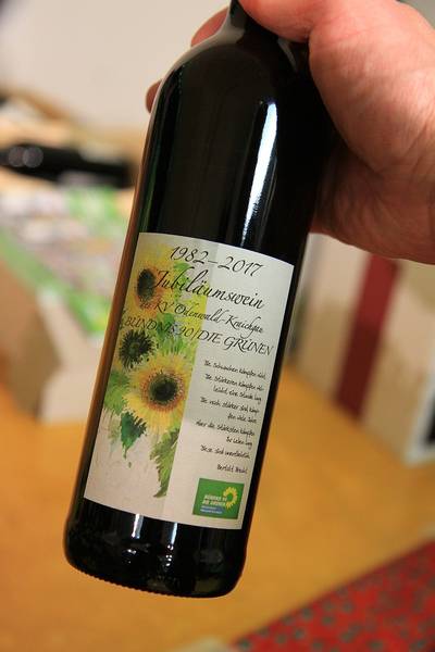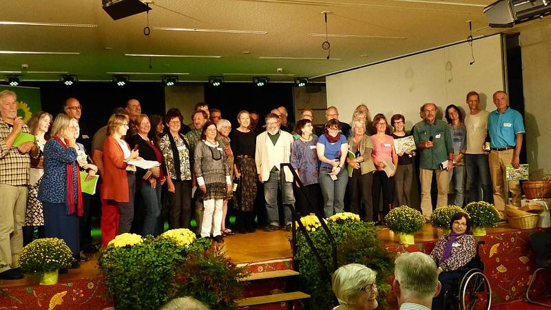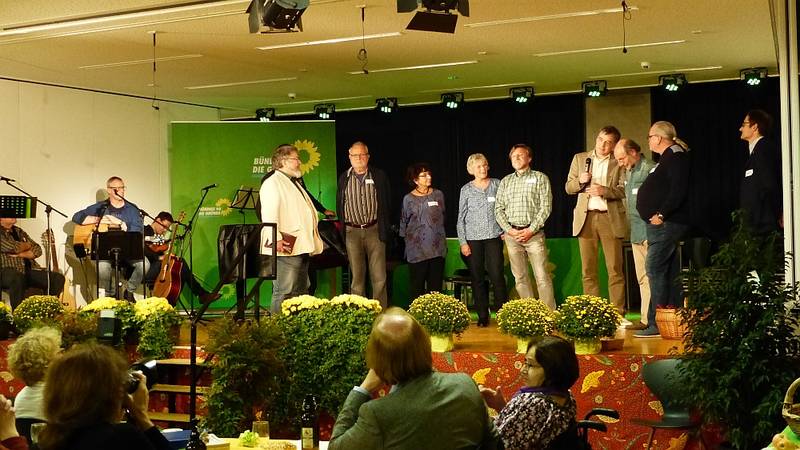 Die anwesenden Gründungsmitglieder werden mit einer silbernen Ansteck-Sonnenblume geehrt und bekommen ebenso wie Mitglieder, die mindestens 25 Jahre dabei sind, eine Flasche Jubiläumswein, eine eigens etikettierte Spezialabfüllung. Zusammen mit den beiden neuesten und dem jüngsten Mitglied und dem Publikum im Saal stimmen sie ein „Grünen-Badnerlied“ an.