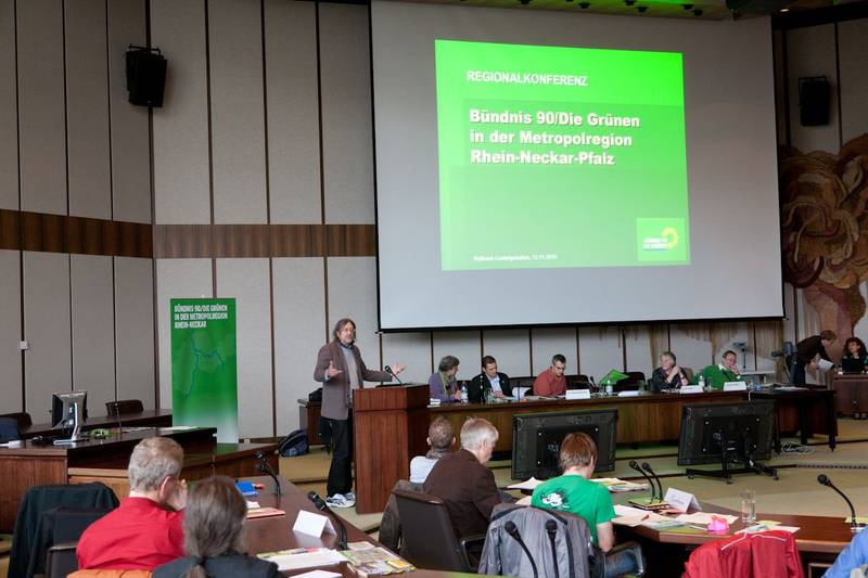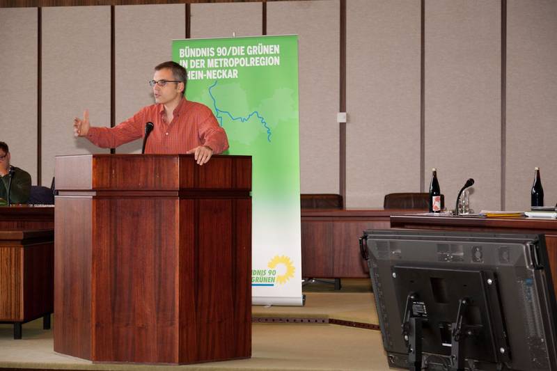 Wolfgang Raufelder, Vorsitzender der Mannheimer Stadtratsfraktion sowie der Regionalfraktion und aussichtsreicher Landtagskandidat schwor die Delegierten auf genaues Hingucken beim Regionalplan ein. Das gigantische Zahlenwerk, das ab 2012 länderübergreifendes Planungsrecht für das nächste Jahrzehnt vorgeben wird und sich derzeit in der Entwurfsphase befindet, kann seiner Ansicht nach eine „grüne Handschrift“ gut gebrauchen. Für den Regionalplan fordert seine Fraktion dringend mehr Beteiligung der Bürgerinnen und Bürger. Ob Absage an hochfliegende Rheinquerungspläne, Kohlekraftwerke und Regionalflughäfen in Mannheim, Speyer und Worms, oder ein Plädoyer für eine gemeinsame Verkehrs- und Umweltpolitik, da sah sich auch Richard Landenberg vom Bund für Umwelt- und Naturschutz mit den Grünen auf einer Linie. „Täglich wird hier immer noch ein ganzer Hektar zubetoniert“, so der Umweltschützer.
