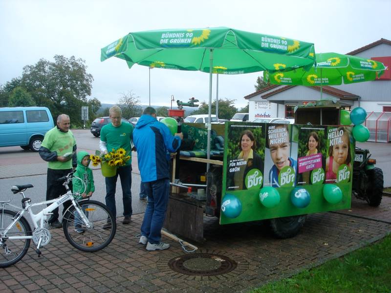 Die Aktion stieß überall auf Begeisterung, wo der grüne „Service-Truck“ vorbeikam. Für die Kinder hatten wir verschiedene kleinere Geschenke wie Luftballons oder Brausepulver im Gepäck und die Erwachsenen versorgten wir mit Informations-Broschüren, sofern gewünscht. Der Damenwelt überreichten wir Sonnenblumen, was ebenfalls guten Anklang fand. Dass in der heißen Phase des Bundestagswahlkampfes auch die eine oder andere politische Diskussion geführt wurde, versteht sich von selbst. Am Ende der Aktion waren alle zufrieden und überzeugt davon, etwas Positives auf die Beine gestellt zu haben.