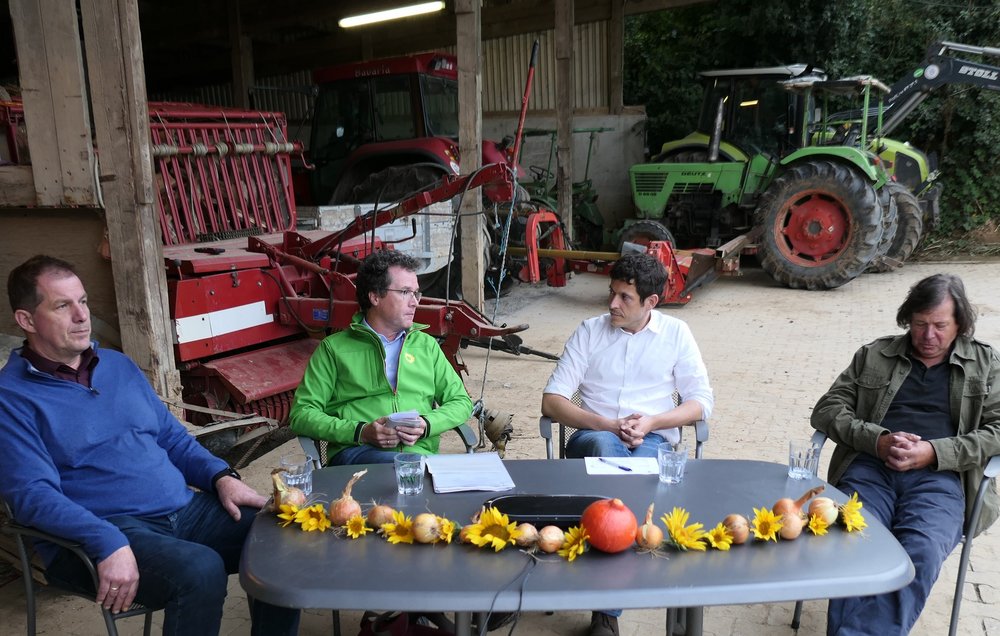 Bei einer Hofbesichtigung informierten sich die Besucher über die Herausforderungen kleiner Agrarbetriebe und der regionalen Vermarktung. Im Rahmen einer online-Podiumsdiskussion vor der Kulisse des Bio-Hofs ging es anschließend um die vielschichtige Frage Wie sieht die Landwirtschaft der Zukunft aus? Es diskutierten Harald Ebner, Obmann der Grünen Bundestagsfraktion im Ausschuss für Ernährung und Landwirtschaft, Bundestagskandidat Jürgen Kretz, Demeter-Landwirt Heimo Linse und der regionale Vermarkter Dirk Agena von Dirks Biokiste aus Mauer.