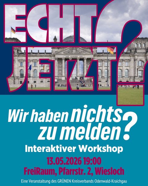 Mit der Veranstaltung „Echt jetzt… wir haben nichts zu melden?“ lädt der Kreisverband von Bündnis 90/Die Grünen zu einem interaktiven Abend rund um das Thema Bürgerbeteiligung ein. Im Mittelpunkt stehen dabei zentrale Fragen: Welche Formen der Bürgerbeteiligung gibt es überhaupt? Wie wirksam sind sie in der Praxis? Und wie realistisch ist ihre Umsetzung?