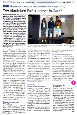 Ein besonders eindringlicher Abend steht jedoch schon jetzt im Kalender: Prof. Dr. Abed Shokry, berichtet am Donnerstag, 9. Oktober 2025, um 20 Uhr im Saal des Wieslocher Kulturhauses aus erster Hand von der unerträglichen Lage der palästinensischen Bevölkerung im Gazastreifen.