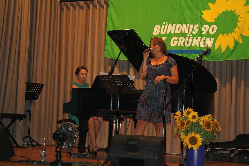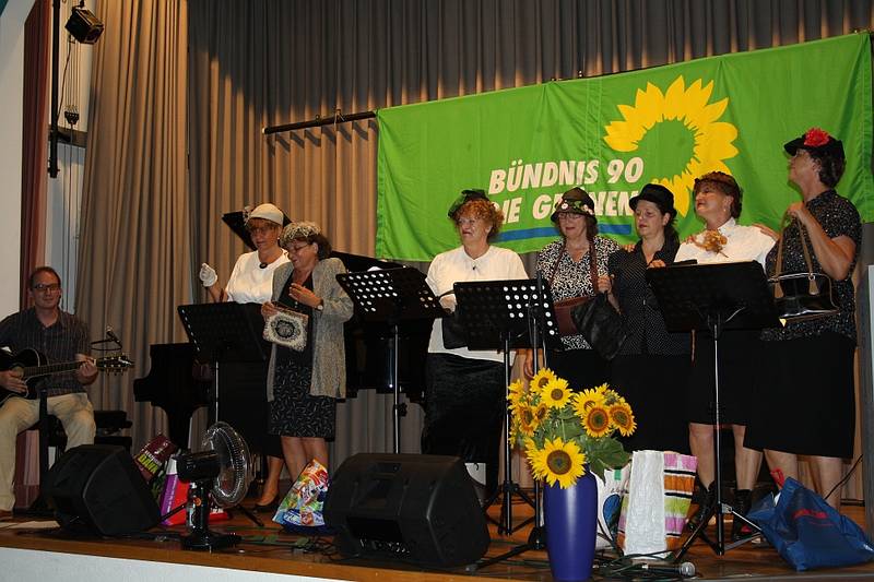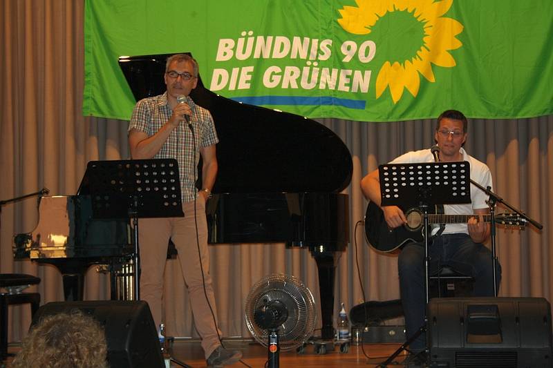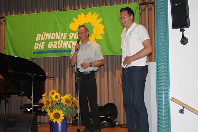 Zum Ausklang gab Kai Schmidt-Eisenlohr noch einige Stücke seines früheren Liedermacher-Daseins zum Besten. Zu später Stunde dankte Stephan Götz, der für den Ortsverband Malsch den Abend moderierte, allen AkteurInnen für diesen unterhaltsamen Abend mit einer Flasche Malscher Traubensaft und - typisch grünen - Sonnenblumen.