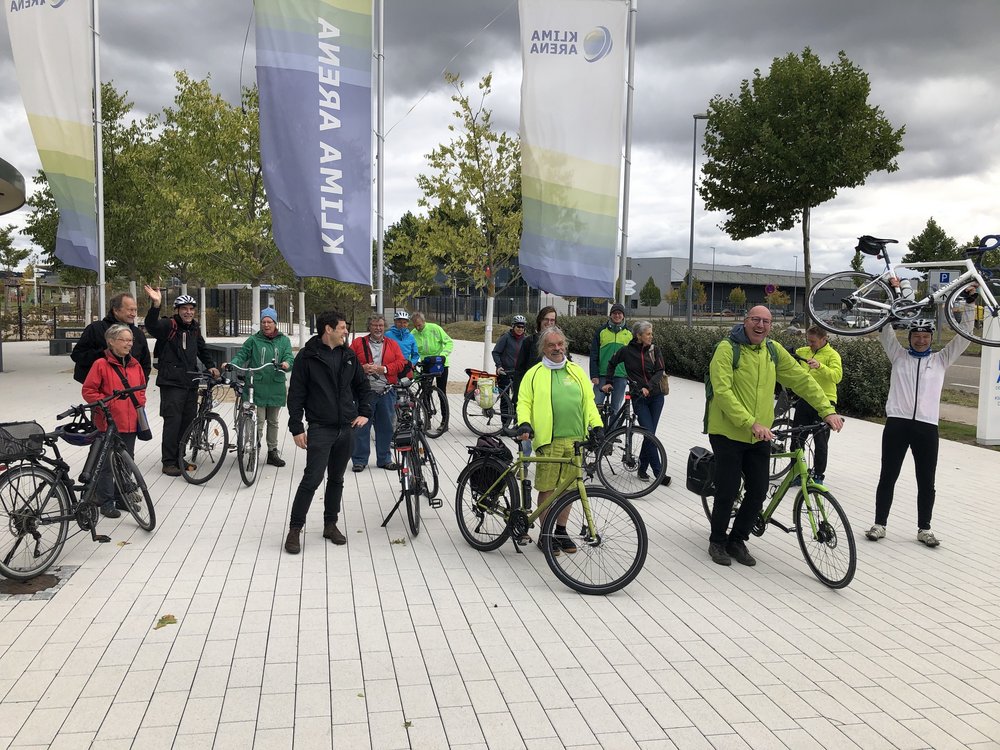 Belohnt wurden die Radler*innen zunächst durch Ansprachen von Hermino Katzenstein und Norbert Knopf. Hermino berichtete über Neuigkeiten aus dem Landtag hier vor allem das Klimaschutzgesetz, in dem eine Reihe von Massnahmen auch gegen große Widerstände durchgesetzt werden konnten. Des weiteren ermutigte er die Anwesenden zu einem aktiven und engagierten Wahlkampf. „Wir müssen kämpfen“, so seine Einschätzung. Norbert, unser Landtagskandidat im WK Wiesloch lobte in seiner Ansprache mit einem Augenzwinkern die Anwesenden für 3x aktive Politik zugleich: 1x aktive Verkehrspolitik, weil sie mit dem Rad angereist sind, 1x aktive Landwirtschaftspolitik, weil man/ frau nun gleich das aktive Angebot des veganen Restaurants in der Klimarena nutzen würde und 1x aktive Bildungspolitik , weil die Informationen der Klimarena zur Klimaüberhitzung, zur Mobilität, zum nachhaltigen Konsum und weiteren Themen für alle höchst relevant sind.